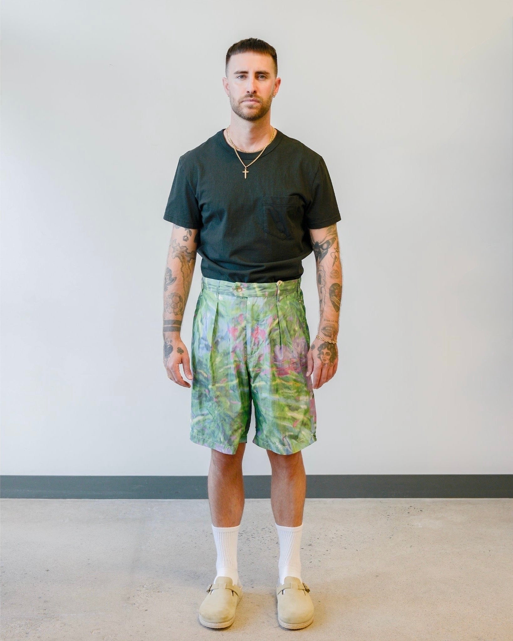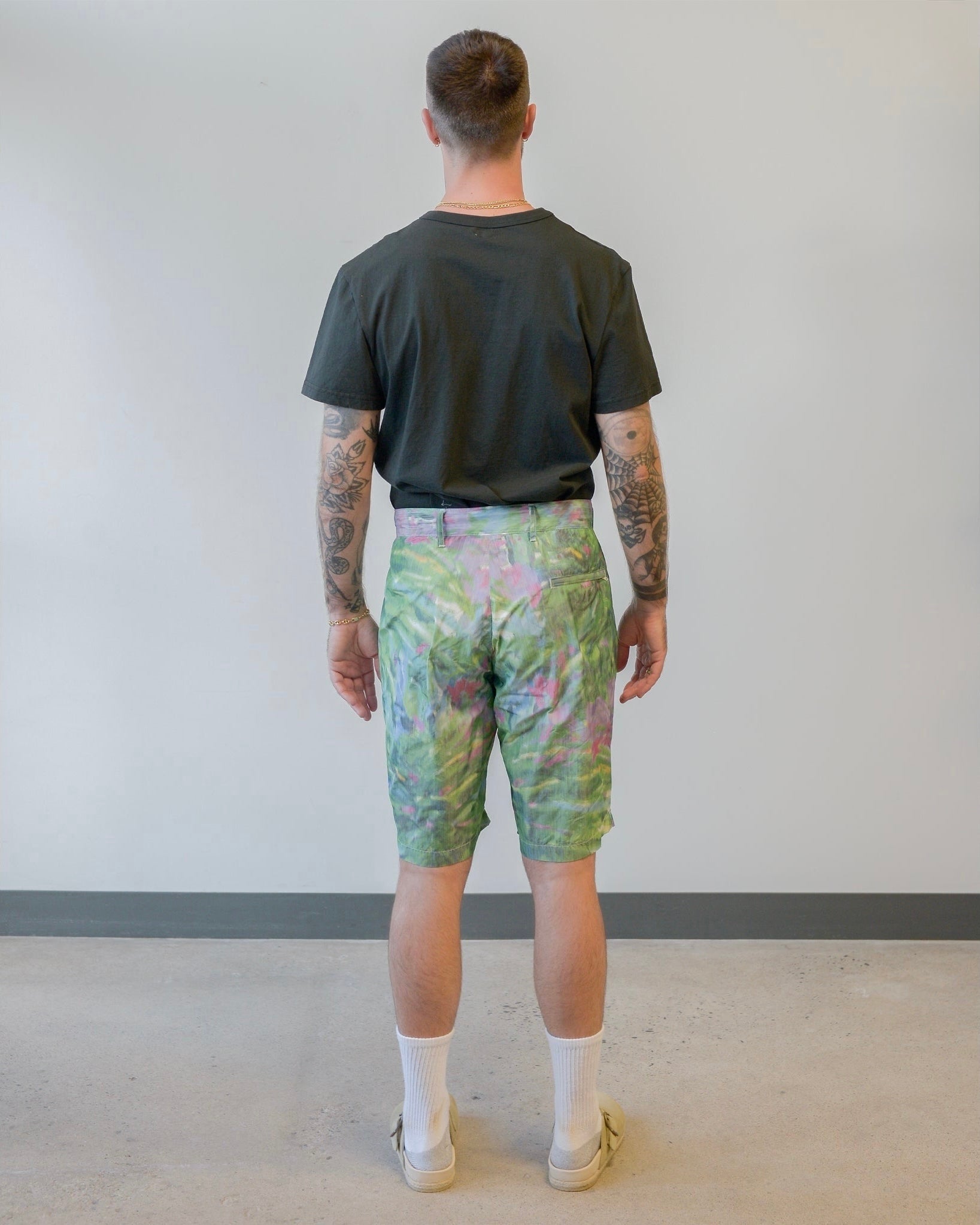 The sunset short from Engineered Garments takes design cues from vintage rugby shorts and turns them into a pair of unique bottoms for spring/summer season. The sunset short is slightly dressier than the fatigue shorts also offered by the brand due to the reverse pleats and tailored fit. We have them available in the very colourful and lightweight floral poly microfiber. These shorts feature a tab waist, internal drawstring adjustment and a rear welt pocket with zip closure.