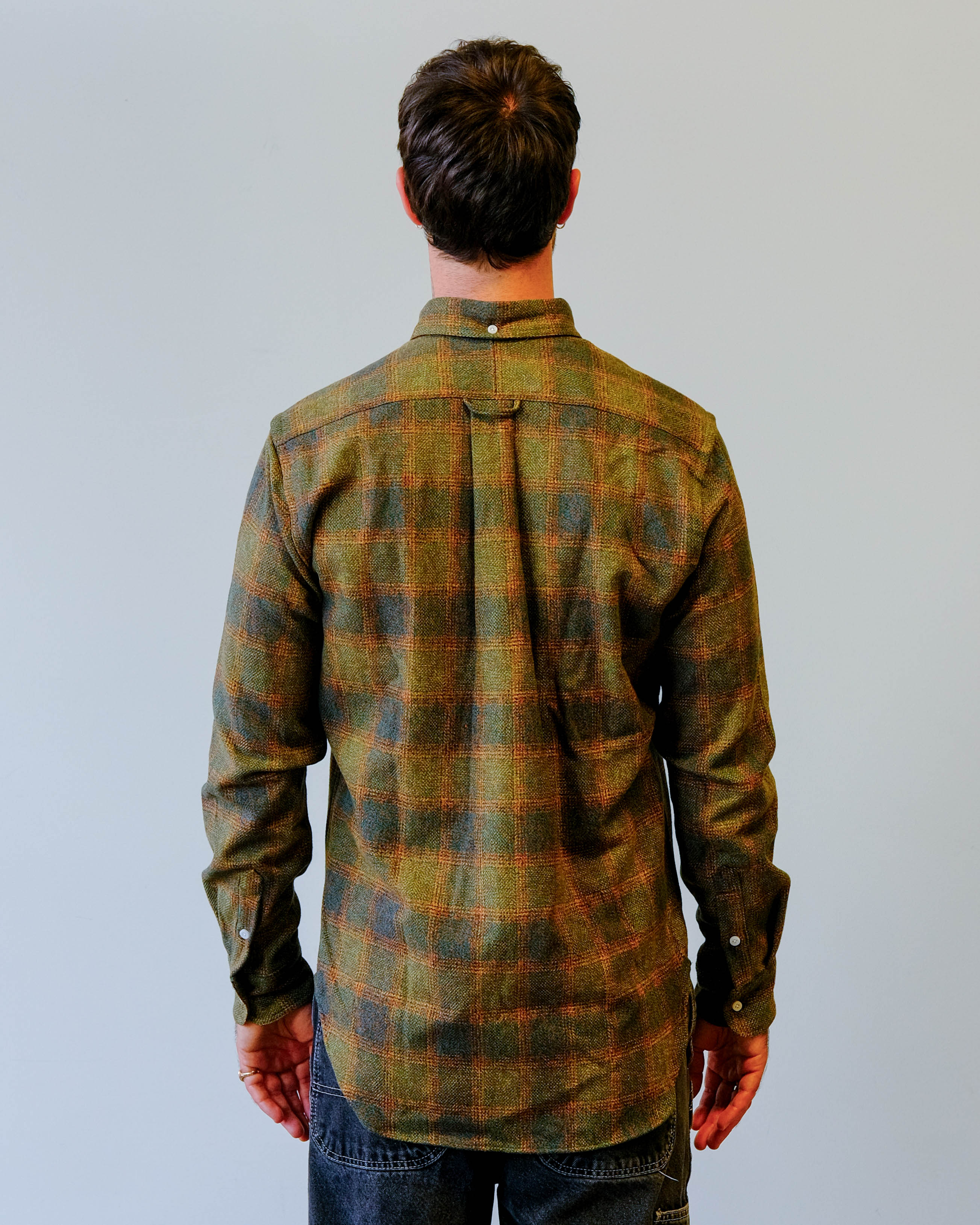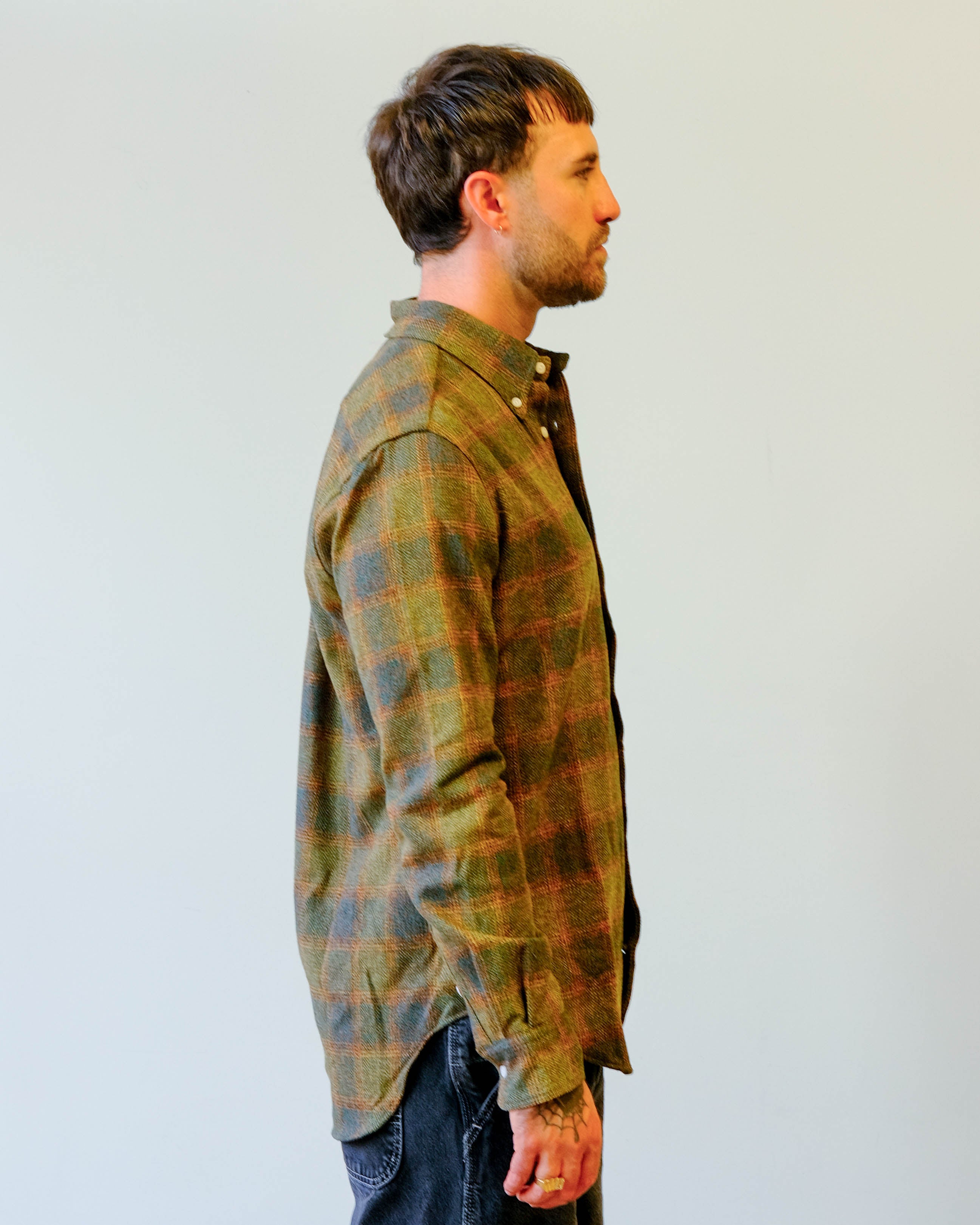 Expertly crafted from 100% cotton, this tweed-inspired shirt from Gitman Vintage is the perfect addition to your autumn/winter wardrobe. The Japan-woven fabric offers a softer touch and heavier drape, while the blend of black, brown, yellow, teal, and red yarns adds a modern twist to the vintage plaid pattern. With a 3-step brushing process for added insulation and softness, this shirt is both stylish and comfortable.