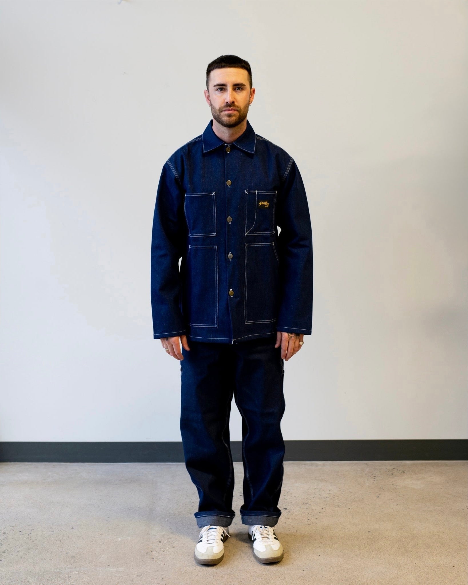 A classic 4 pocket work jacket from Stan Ray. Produced from raw indigo denim and featuring triple-needle stitched main seams, 4 single-needle patch pockets with pen pocket and riveted buttons.
